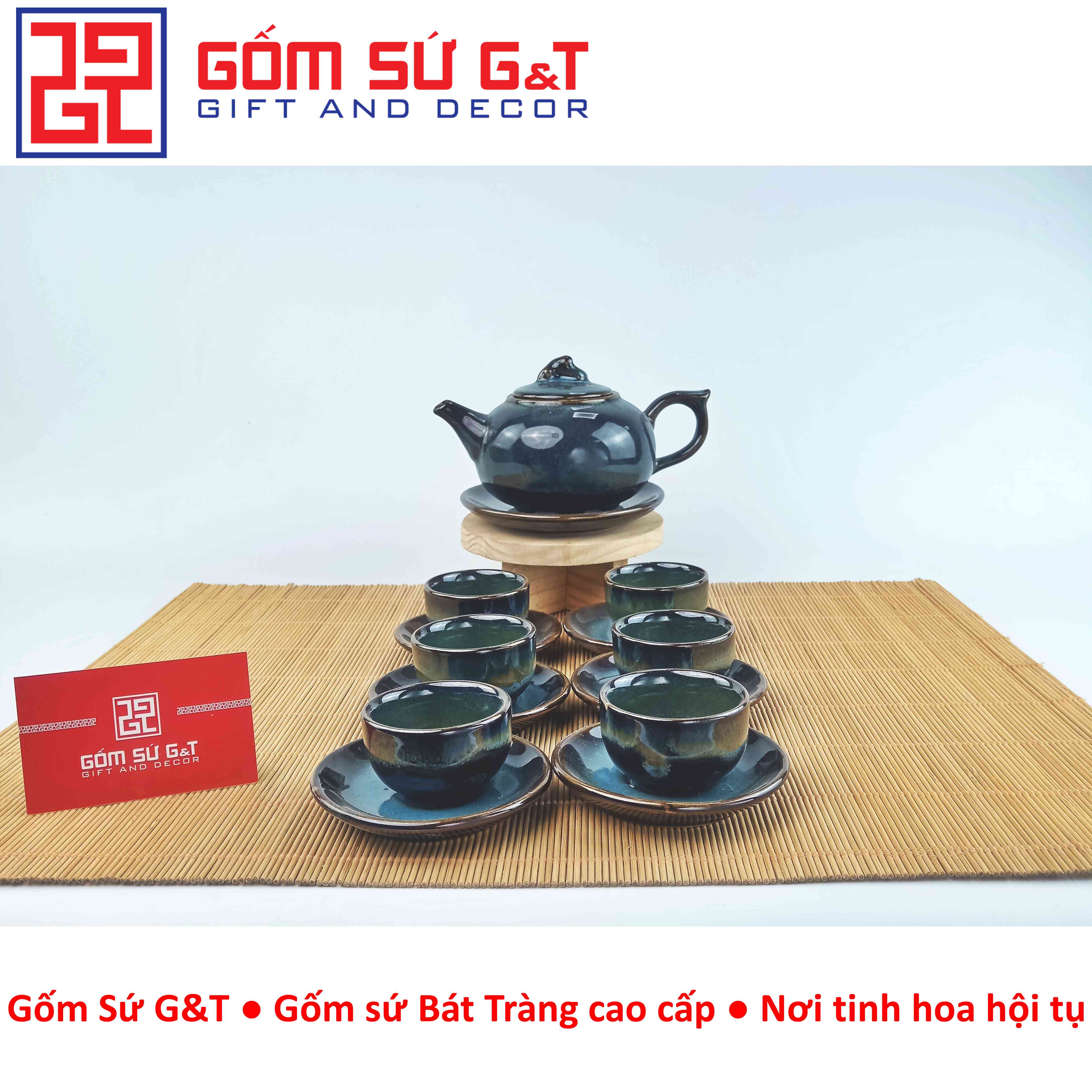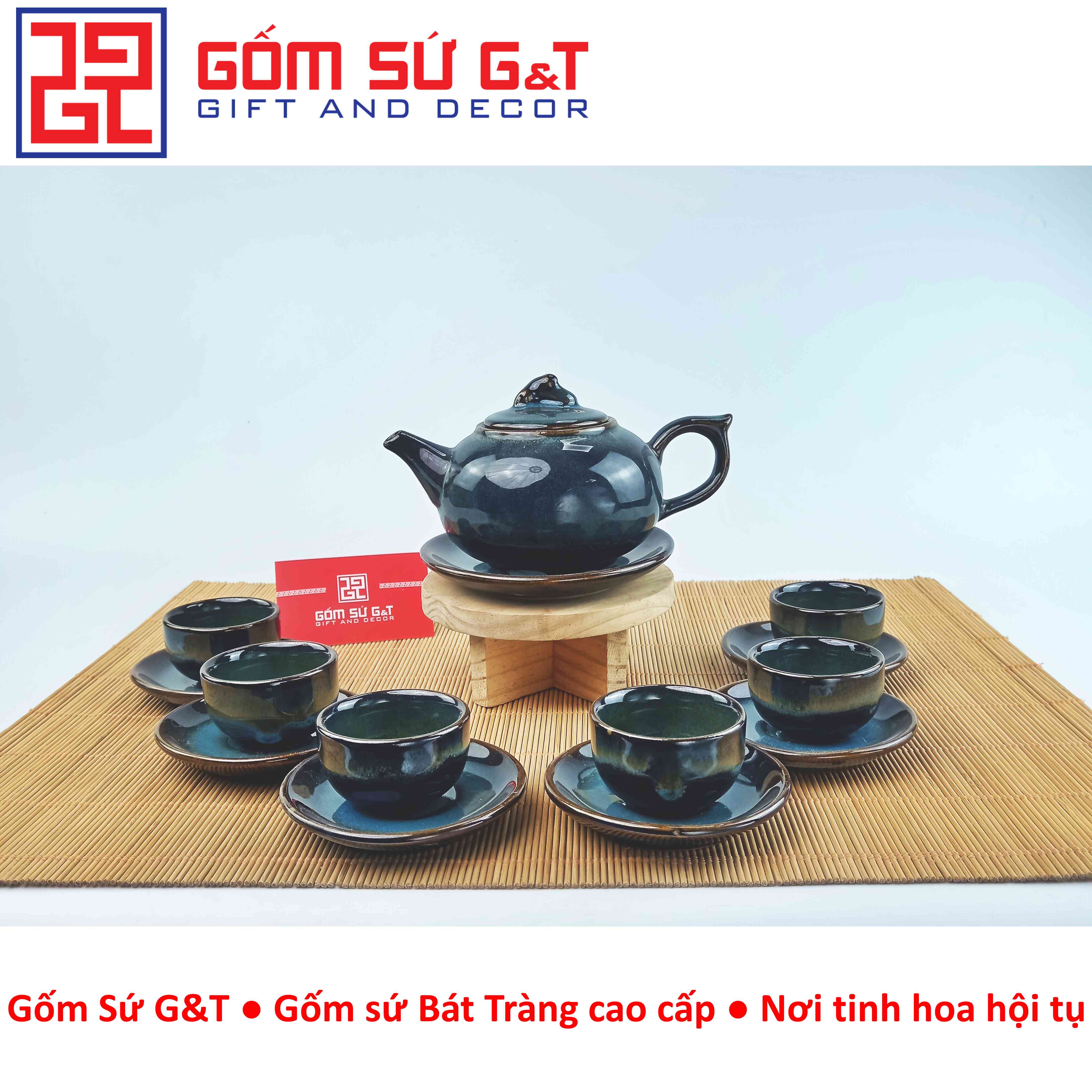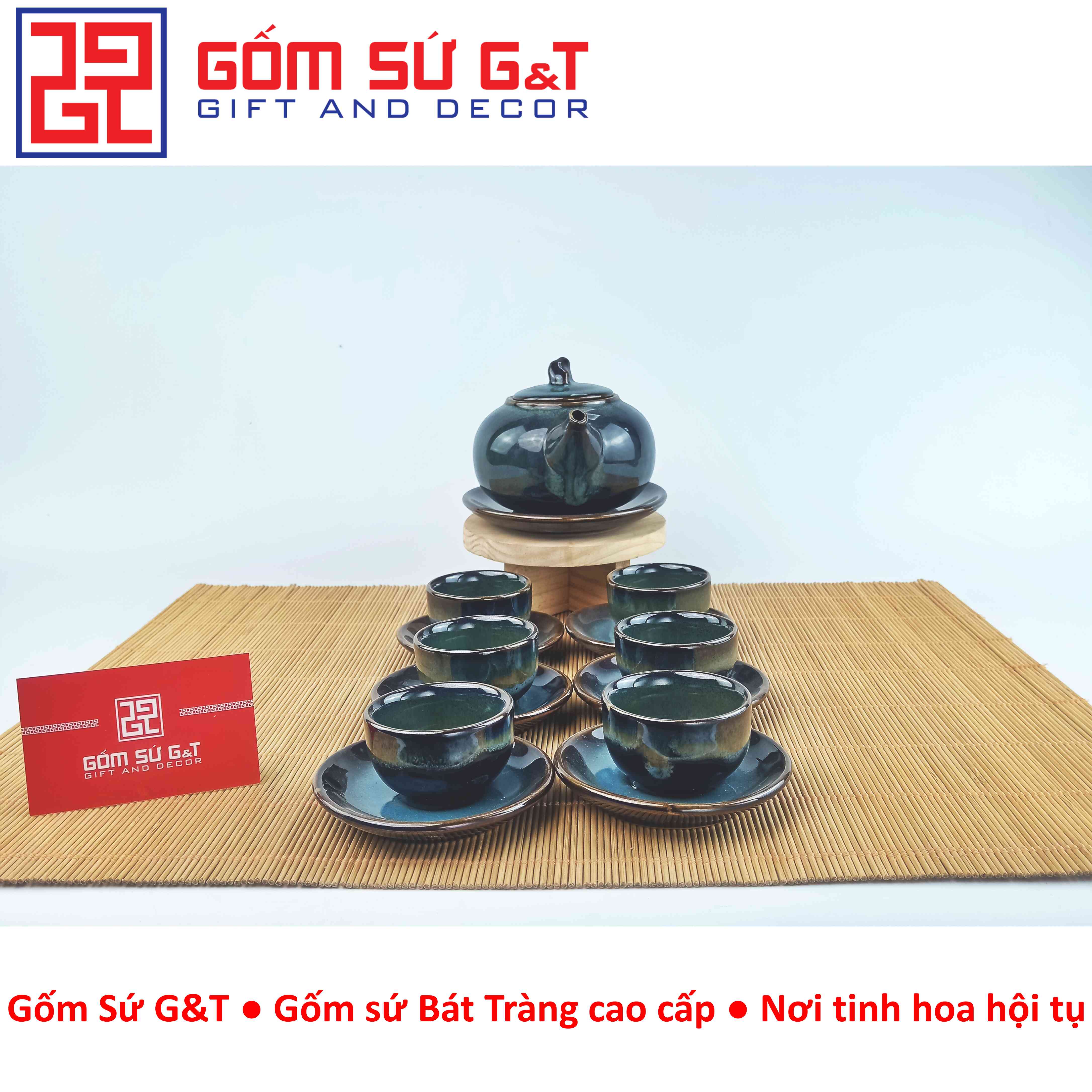 Điểm nổi bật của ấm chén hỏa biến Bát Tràng là lớp men hỏa biến đặc trưng, được tạo nên từ quá trình nung ở nhiệt độ cao, khiến cho mỗi sản phẩm đều có sự biến đổi màu sắc độc nhất vô nhị. Màu men xanh đen pha ánh đồng huyền bí, phản chiếu ánh sáng tạo nên chiều sâu và vẻ đẹp cuốn hút. Sự chuyển màu ngẫu nhiên trên bề mặt giúp mỗi bộ ấm chén mang một dấu ấn riêng, không có sản phẩm nào giống nhau hoàn toàn.