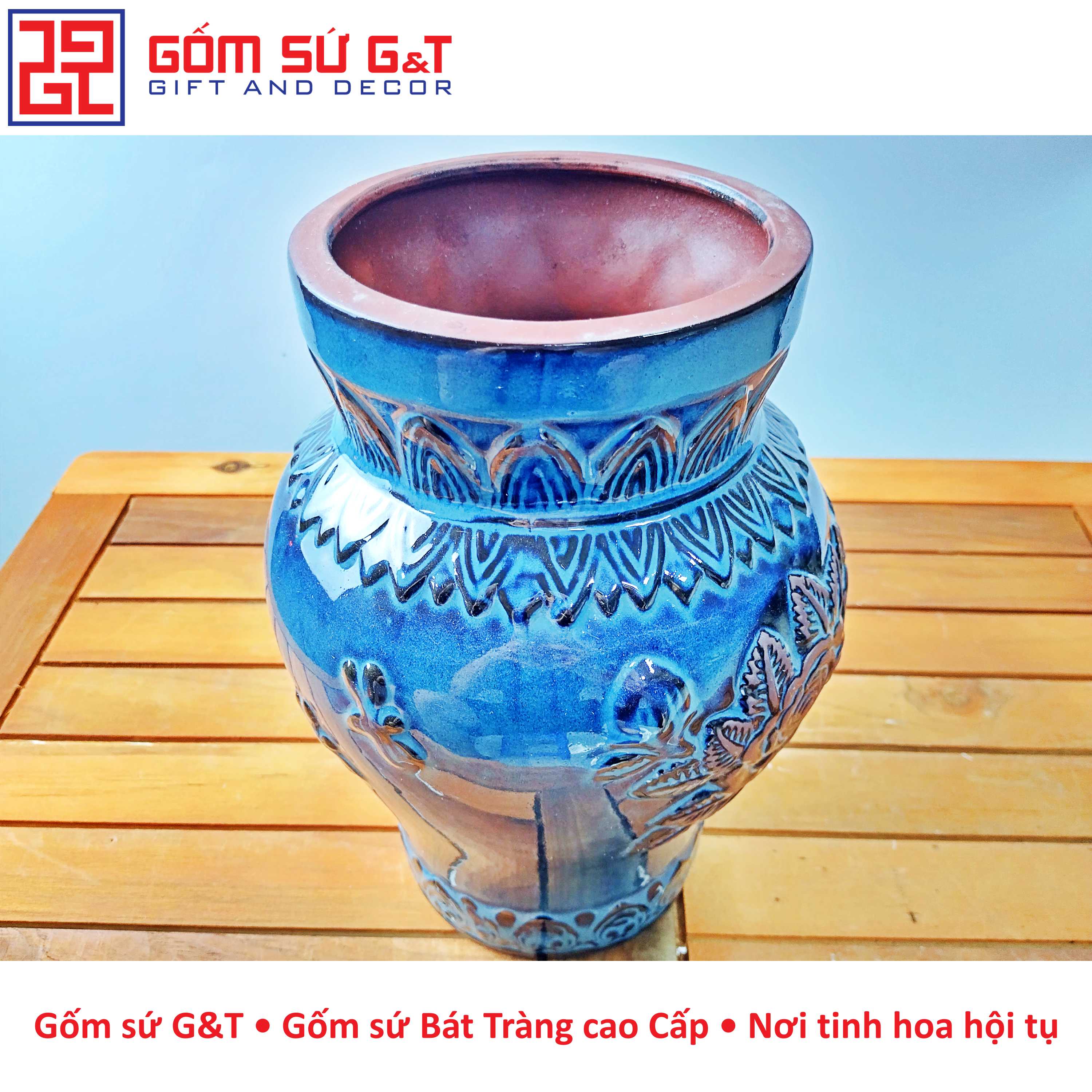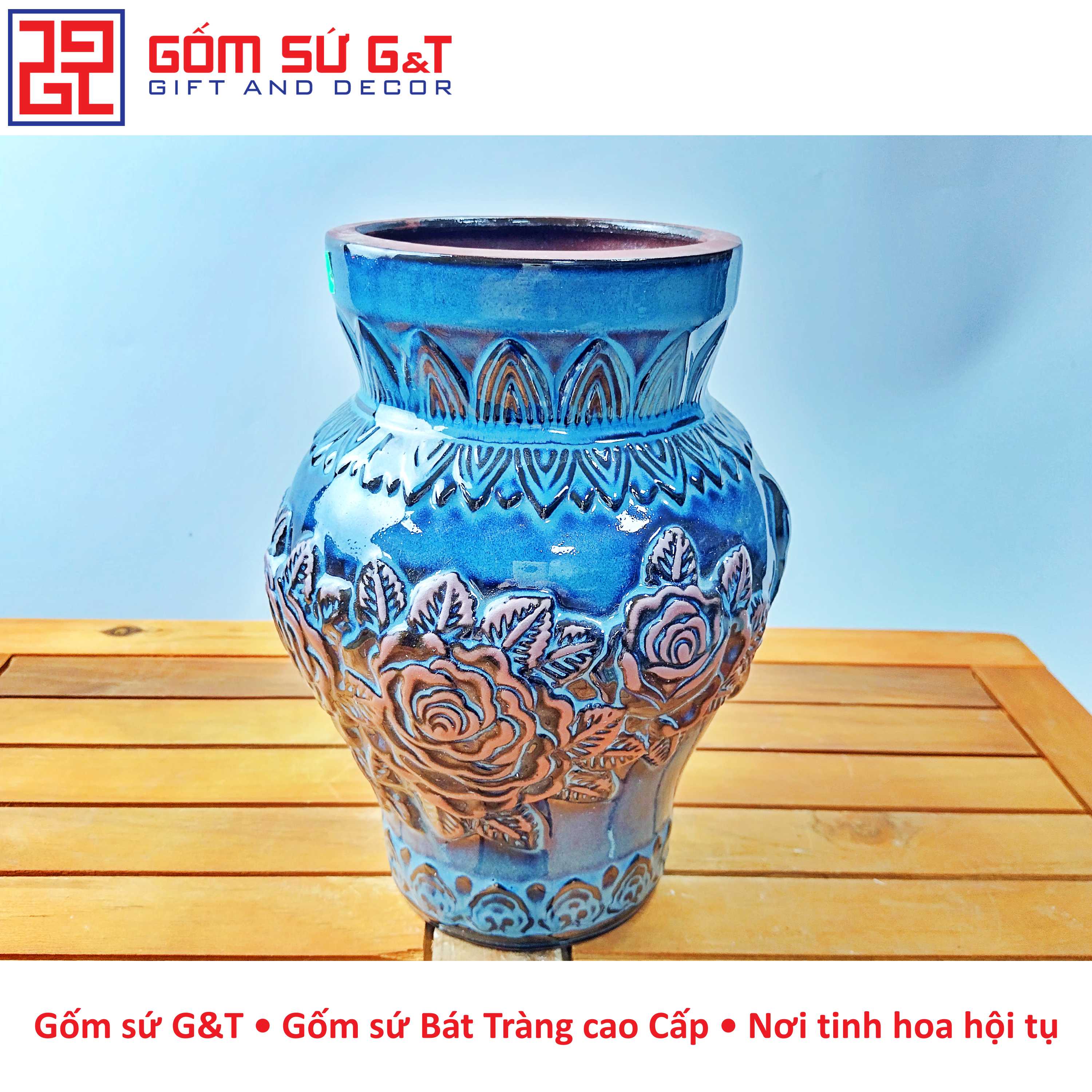 Lọ hoa cổ thẳng khắc hoa hồng Bát Tràng được biết đến với sự tỉ mỉ và tinh tế của các hoa văn khắc trên bề mặt gốm. Đây là một loại lọ hoa độc đáo và đẹp mắt được tạo ra từ làng gốm nổi tiếng Bát Tràng ở Việt Nam.