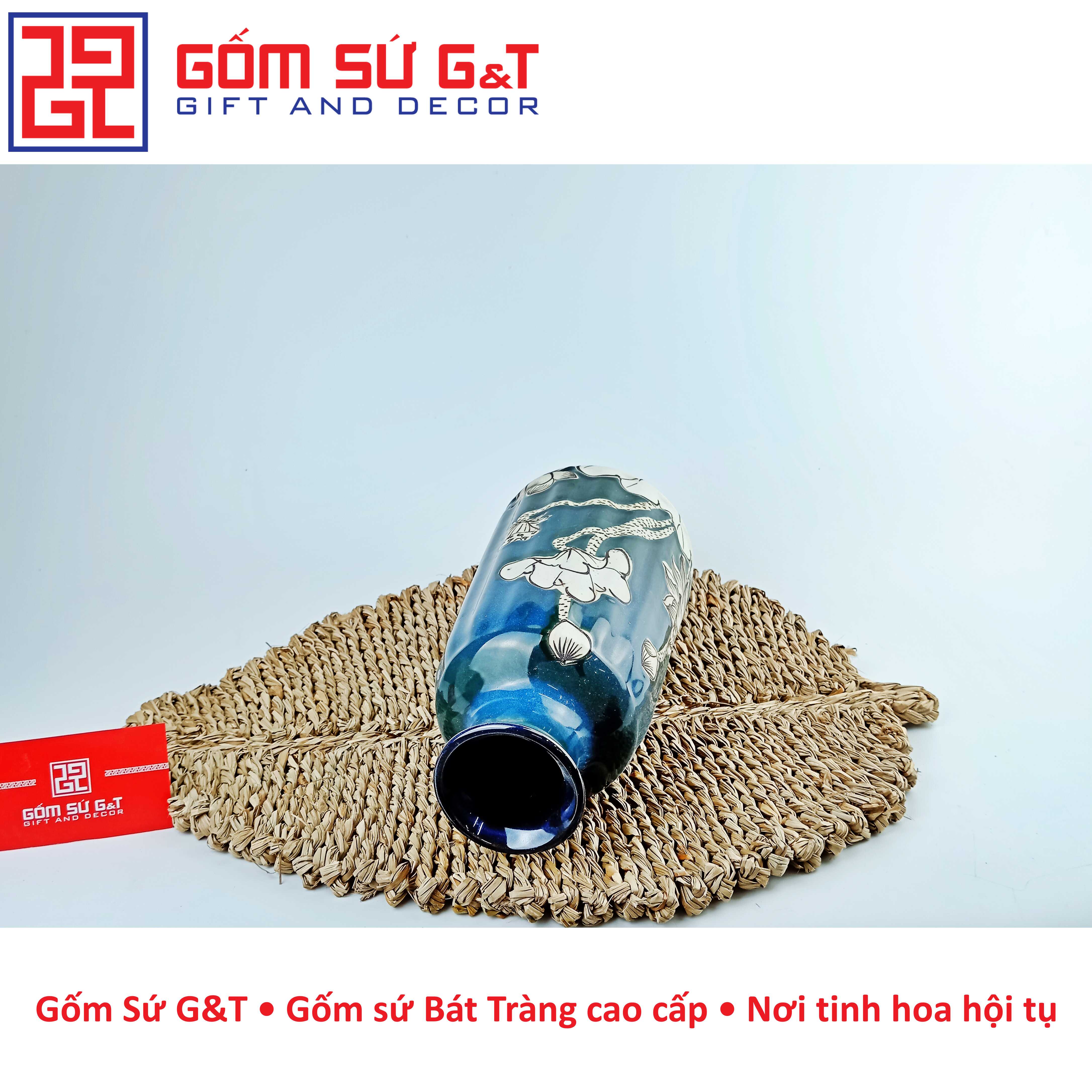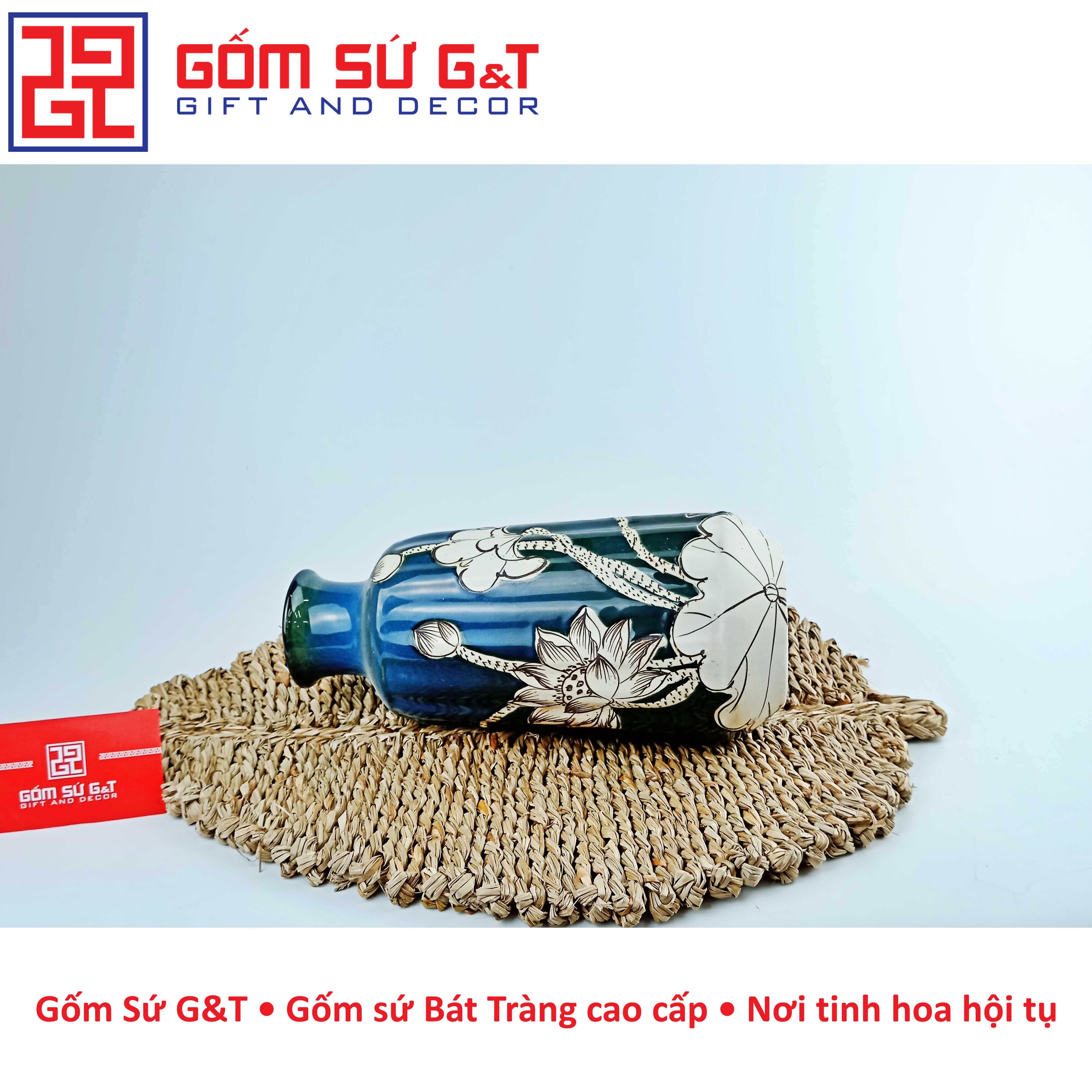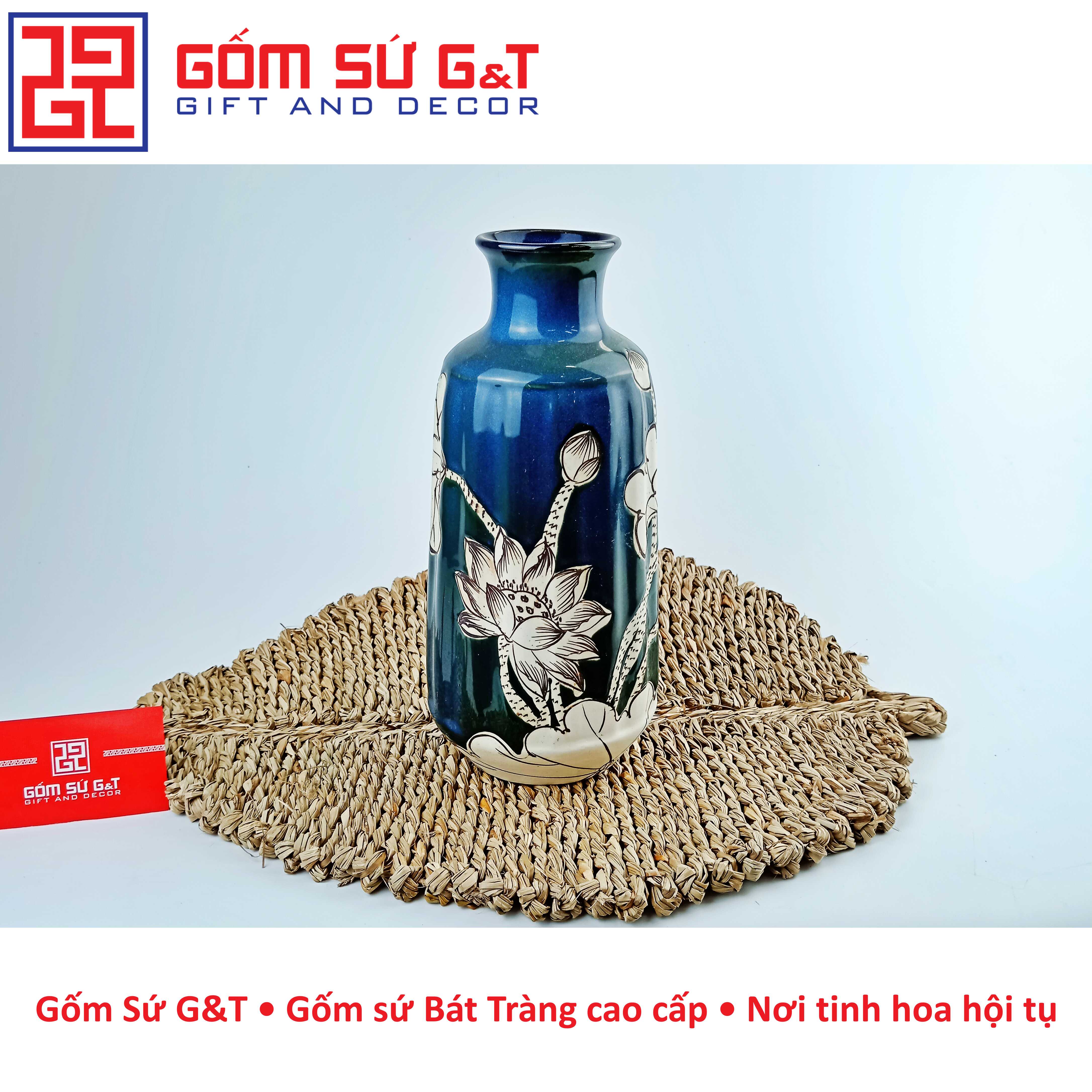 Lọ hoa dáng dọc dừa vẽ sen nổi của gốm Bát Tràng có nhiều kiểu dáng khác nhau, từ kiểu dáng cổ điển đến kiểu dáng hiện đại, phù hợp với nhiều phong cách trang trí khác nhau. Chất liệu gốm sứ cao cấp giúp lọ hoa trang trí của gốm Bát Tràng có độ bền cao và độ bóng sáng đẹp mắt.