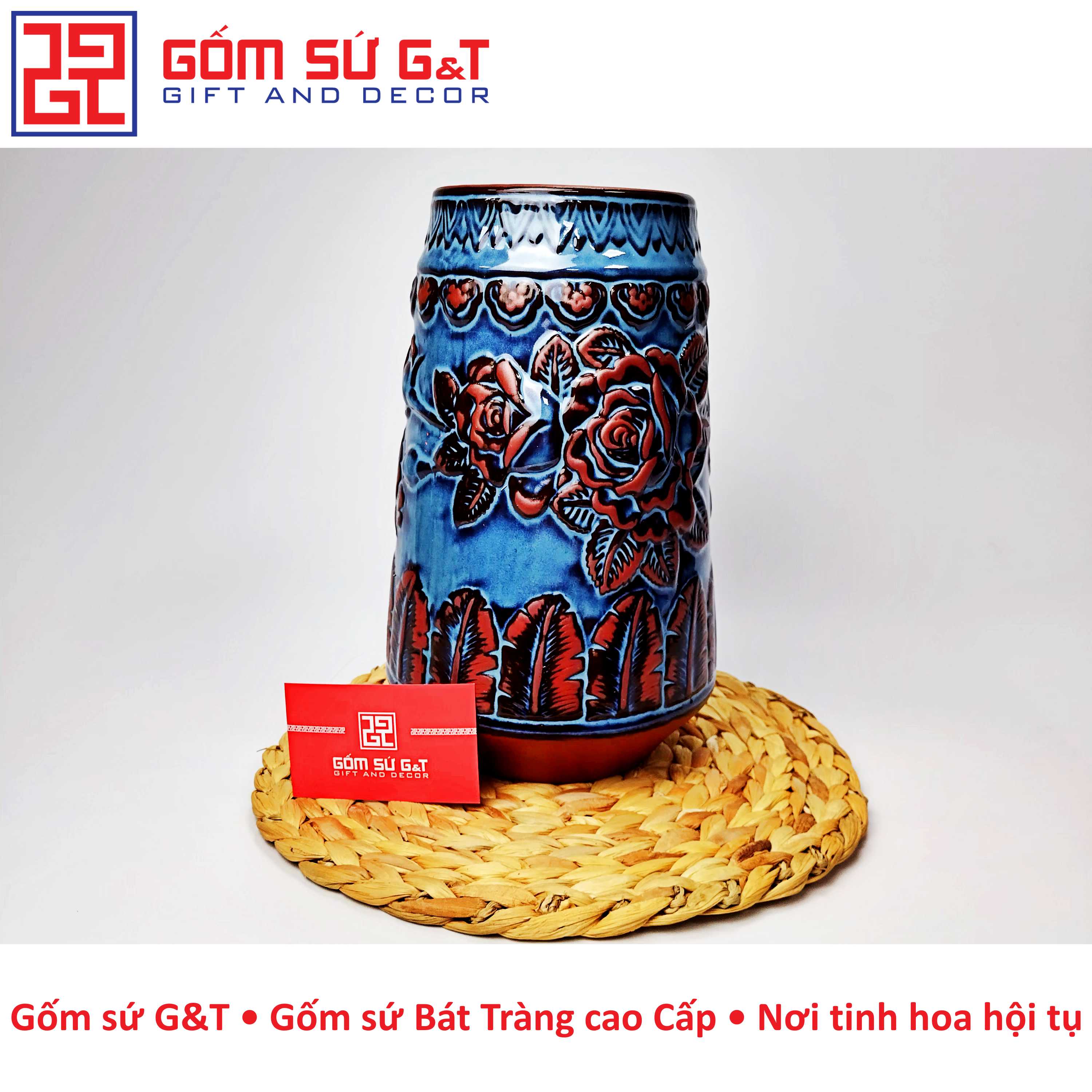 Lọ hoa dáng ống khắc hoa hồng Bát Tràng được biết đến với sự tỉ mỉ và tinh tế của các hoa văn khắc trên bề mặt gốm.