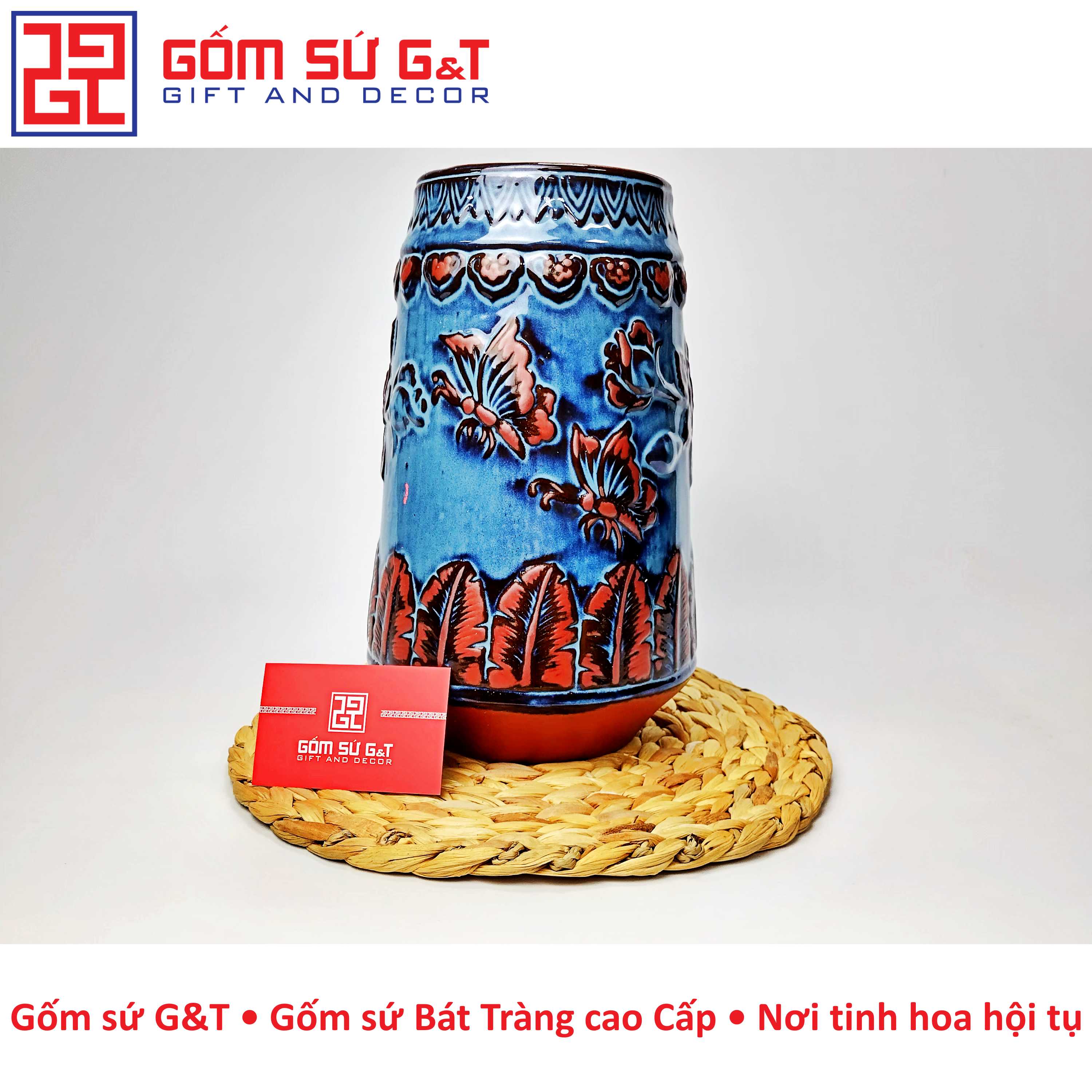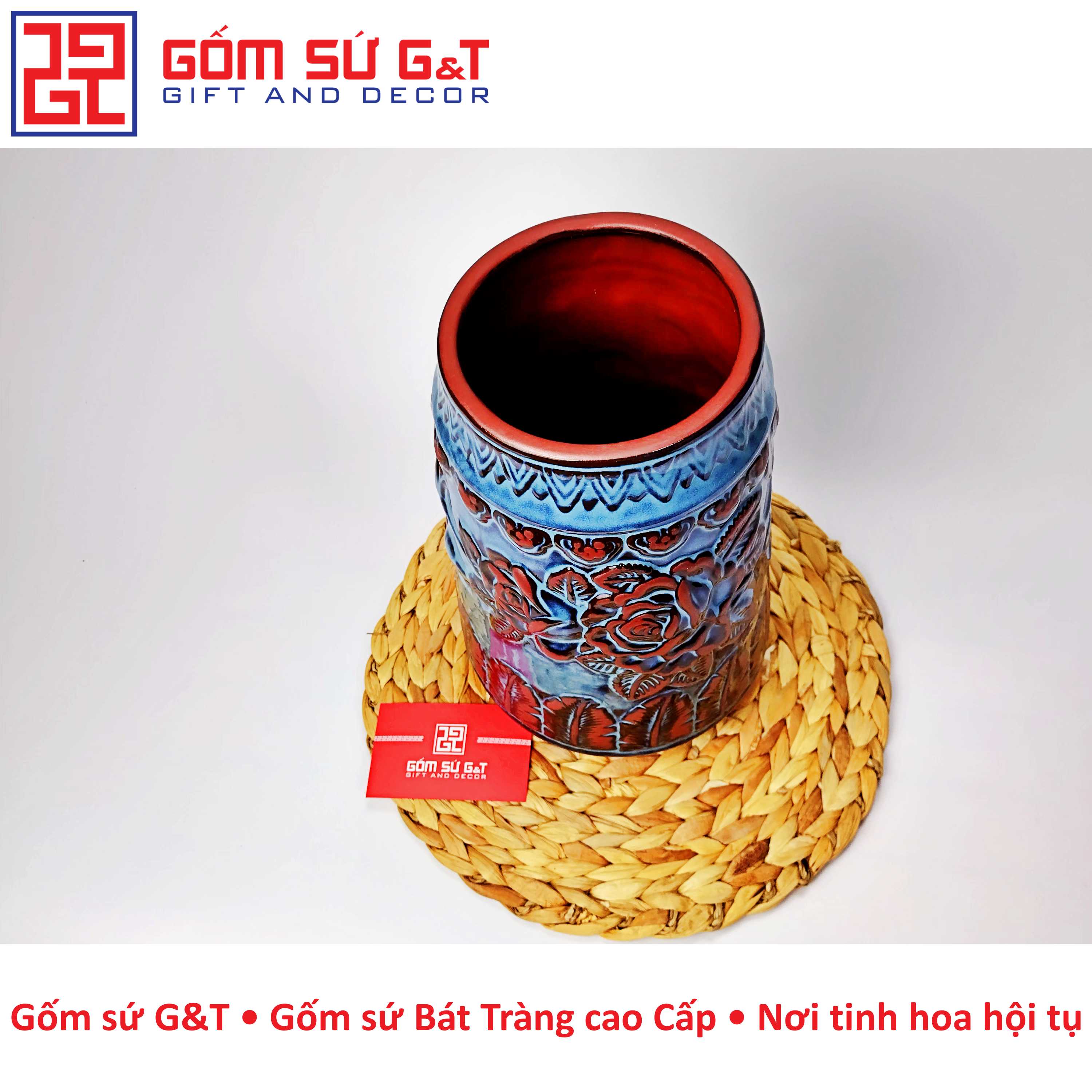 Lọ hoa dáng ống khắc hoa hồng Bát Tràng là sự kết hợp hoàn hảo giữa nghệ thuật gốm và khắc trên gốm. Các hoa văn và họa tiết được khắc nổi trên bề mặt lọ, tạo nên một cái nhìn độc đáo và tinh tế. Những đường nét chạm khắc được tạo ra bằng tay, đòi hỏi sự khéo léo và kỹ thuật cao của những nghệ nhân Bát Tràng.