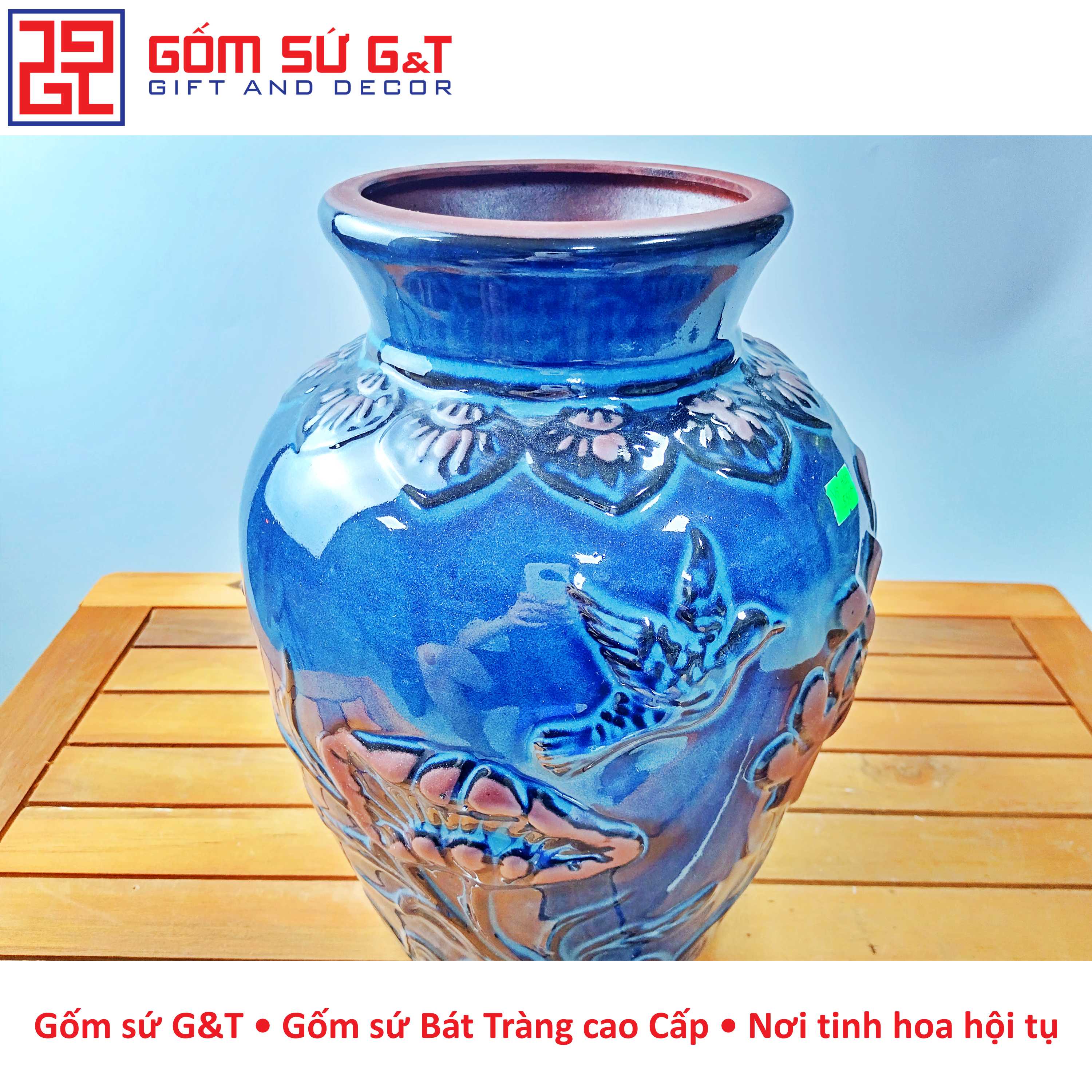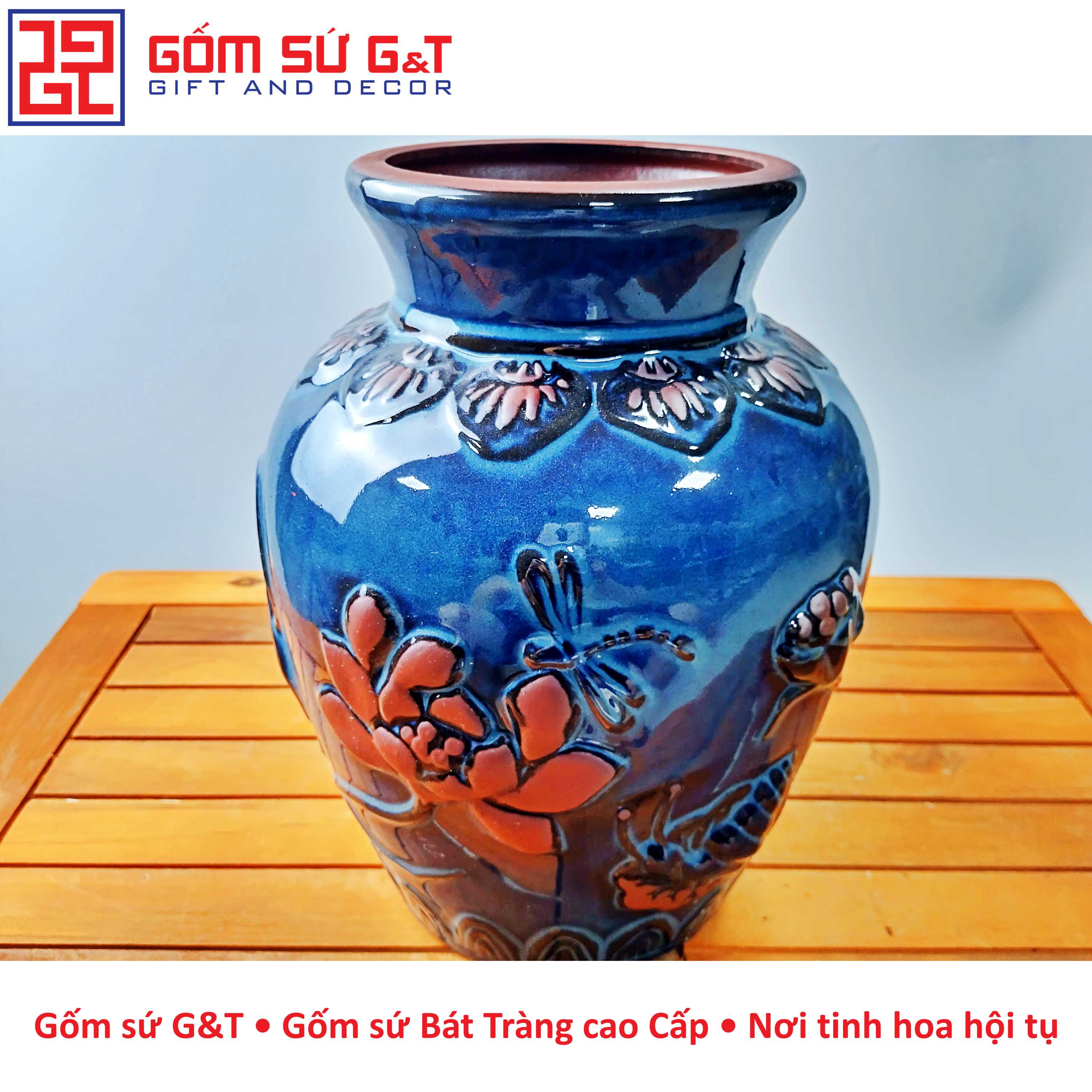 Lọ hoa dáng vò khắc sen Bát Tràng được biết đến với sự tỉ mỉ và tinh tế của các hoa văn khắc trên bề mặt gốm. Đây là một loại lọ hoa độc đáo và đẹp mắt được tạo ra từ làng gốm nổi tiếng Bát Tràng ở Việt Nam.