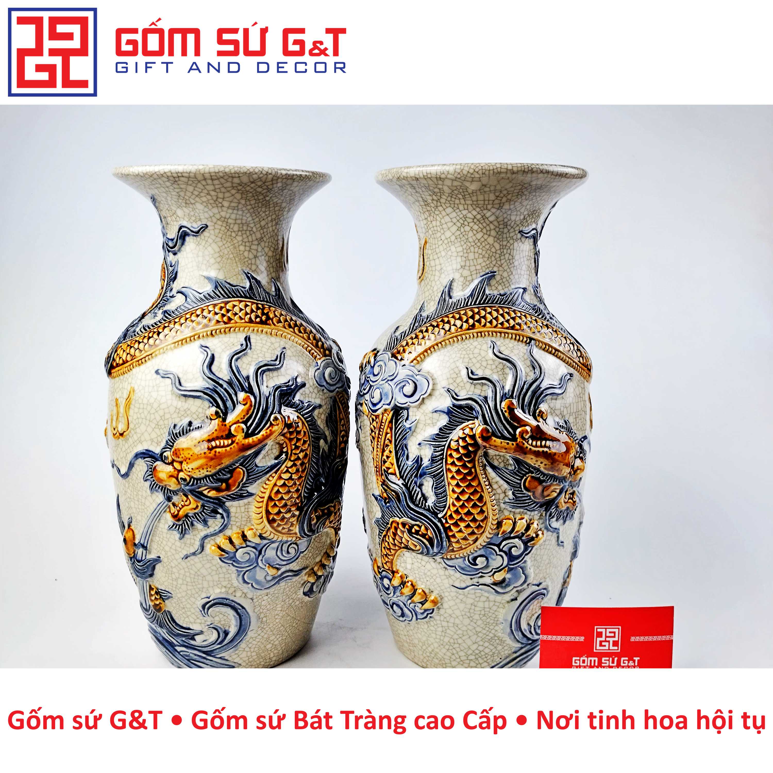 Lọ lộc bình men rạn đắp rồng được làm thủ công bằng kỹ thuật đắp nổi trên bề mặt men rạn. Các họa tiết và chi tiết với hình ảnh con rồng được tạo ra một cách tỉ mỉ và tinh xảo, tạo nên một sản phẩm gốm nghệ thuật độc đáo và hấp dẫn.